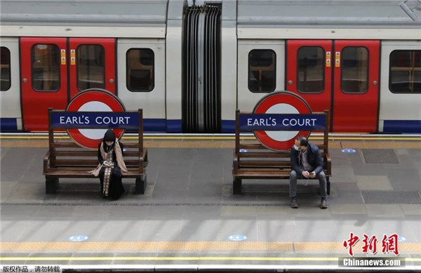 资料图:英国伦敦出行的市民坐在伯爵法院站的长凳上。