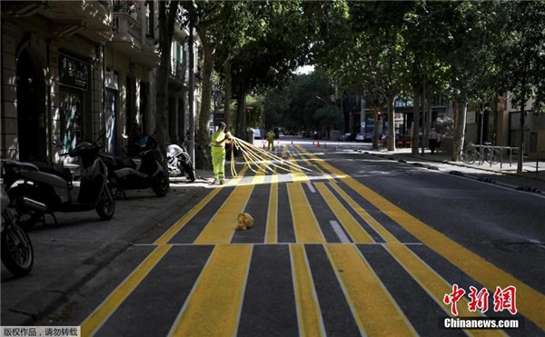 资料图:西班牙巴塞罗那街道上,工人们扩展人行道面积,以便利行人保持社交距离。