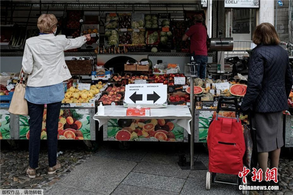 资料图:曾经被列为意大利疫情“红区”的北部小镇圣菲奥拉诺逐步解封,两名小镇居民在购物时保持安全距离。