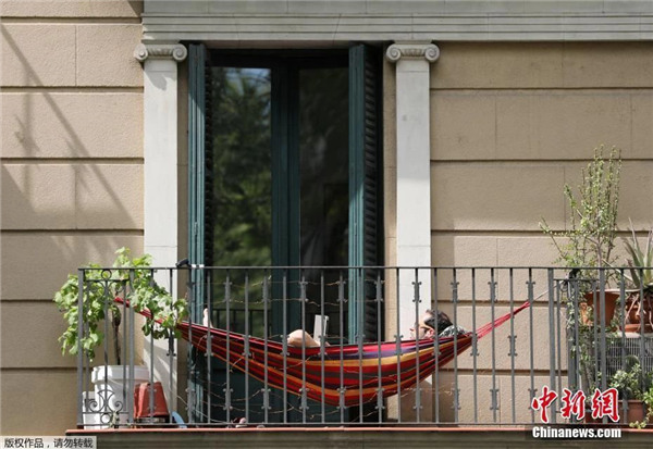 资料图:西班牙巴塞罗那居民在阳台上享受好天气。