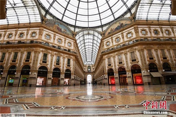 资料图:意大利米兰市中心空无一人的维托里奥·埃马努埃莱二世购物中心。