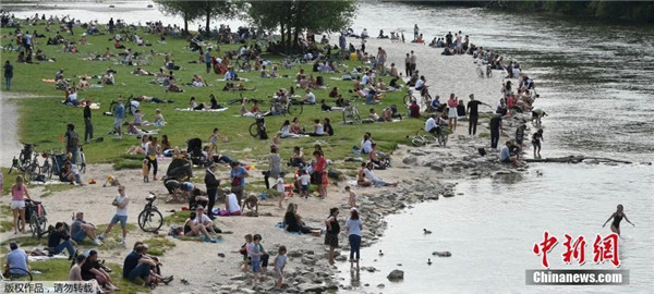 资料图:德国慕尼黑的伊萨尔河附近,人们在河边享受暖春天气。