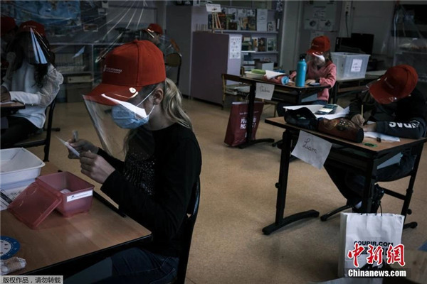 资料图:当地时间5月12日,法国中部圣埃蒂安附近的拉格兰德克罗伊市,当地小学生戴着统一发放的面罩上课。
