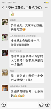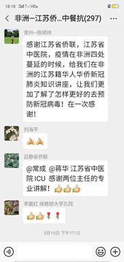 讲座后,肯尼亚江苏商会常务副务长陈顺祥、刚果中华总商会会长张琪等侨领纷纷表示:感谢江苏省侨联、江苏省中医院!疫情在非洲四处蔓延的时候,给我们在非洲的江苏籍华人华侨举办新冠肺炎知识讲座,让我们更加了解了怎样更好地去预防新冠病毒!再一次感谢!