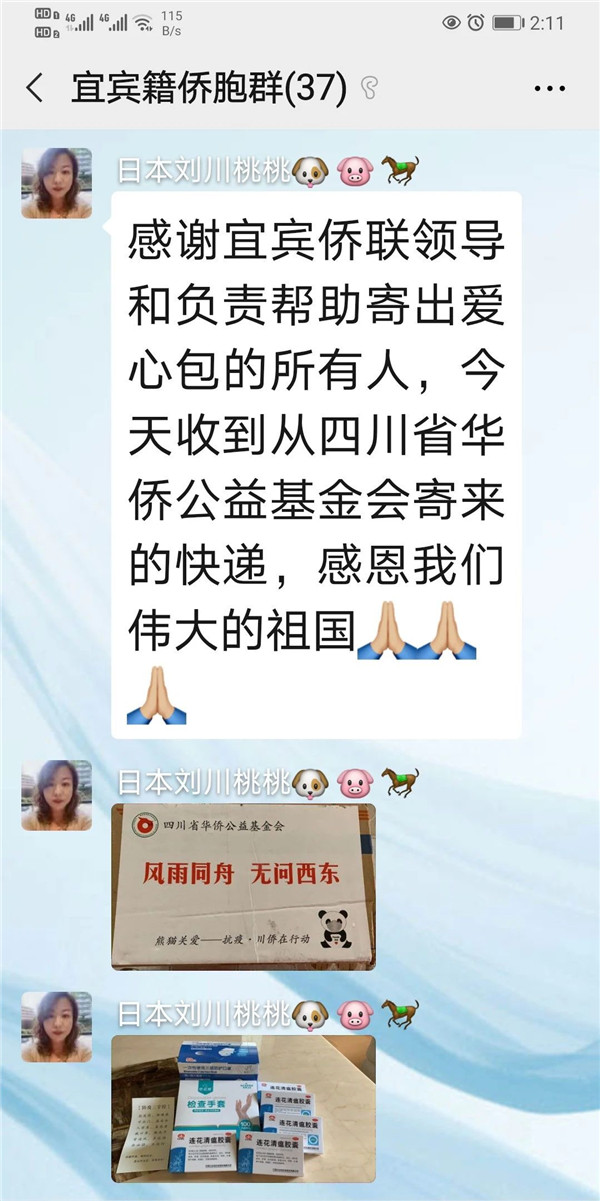 海外疫情加速蔓延,广大海外华侨、留学人员在异国他乡面临种种困难,尤其是缺乏口罩、消毒液、中成药等个人防护物资,而国内家属缺乏购买渠道,内心十分焦急。宜宾市侨联通过省侨联、省华侨公益基金向宜宾籍海外侨胞及留学生总共发放了30多个爱心包裹,里面有口罩、一次性手套、连花清瘟胶囊等抗疫物资。一位旅日侨胞收到来自家乡的爱心包裹,非常激动地说:“有了这些抗疫物资,心里就安定了,外出有了安全感。家乡的爱心包裹是及时雨,真正的雪中送炭,感谢宜宾市侨联、感谢四川省侨联,感恩我们伟大的祖国。”(宜宾市侨联)