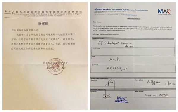 市侨联海外顾问、新加坡万和教育集团董事长穆立国介绍说,万和教育集团累计在新加坡捐赠136000只口罩,价值约40余万人民币,捐给了中国大使馆,新加坡本地社区,非营利性组织,学校和外籍劳工中心,同时协助外籍劳工中心受捐额外10万只口罩,价值30万人民币。