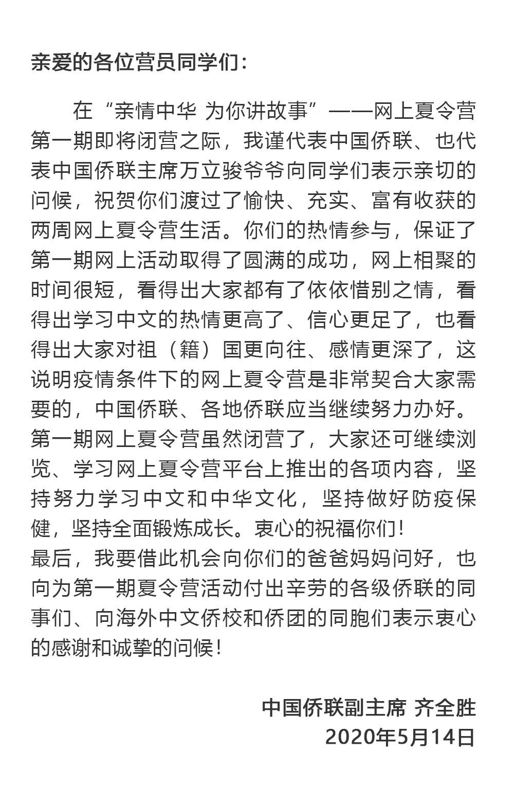 中国侨联副主席齐全胜代表中国侨联主席万立骏,为第一期闭营仪式录制了音频讲话,勉励营员们坚持学习中文和中华文化,坚持全面锻炼成长。