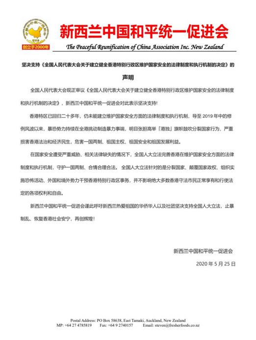 边自立会长并向记者展示了以新西兰中国和平统一促进会会长黄玮璋先生为代表的该会理事会成员们所起草的《声明》,《声明》表示:新西兰中国和平统一促进会全体理事会成员们坚决支持全国人大代表们正在审议的《建立健全香港特别行政区维护国家安全的法律制度和执行机制的决定草案》,其《声明》原文原件如下: