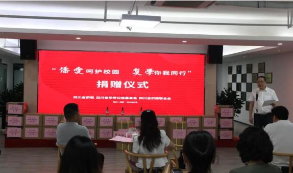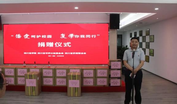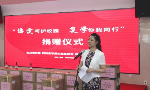 为全面贯彻落实党中央和省委关于做好复工复学疫情防控的部署,在四川省侨联指导下,5月29日下午,由四川省华侨公益基金会与四川省侨商联合会联合举办的“侨爱呵护校园 复学你我同行”活动捐赠仪式在四川侨之家举行。中国侨联副主席、四川省侨联主席刘以勤,四川省侨联副主席徐永明,中国侨商联合会常务副会长、四川省侨联副主席、四川省侨商联合会会长薛水和,成都市侨联主席刘智慧等领导出席捐赠仪式并向院校代表发送抗疫物资。