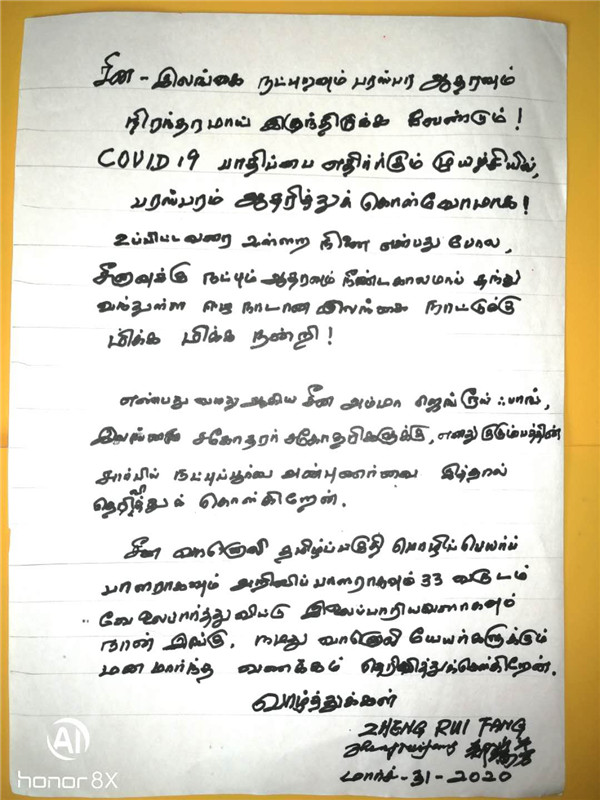 家住西城区月坛街道的印尼归侨郑瑞芳老人,曾在中国国际广播电台泰米尔语广播部工作了三十多年。她时常教导子女要爱国、勤勉、敬业。在此次疫情中,全家人都以不同的方式,积极参与疫情防控工作,展示了侨界家庭的家国情怀。郑老师的大女儿作为一名侨联干部,中央广播电视总台国广侨联主席、月坛街道侨联委员,积极为抗疫捐款。在疫情防控期间,她主动协助总台老干部局电话慰问本单位的空巢老归侨,为独居老侨做心理疏导,帮助患有基础疾病的空巢老侨开药拿药并设法送到老侨手中。郑老师的小女儿在中科院生态环境研究所工作,参与中国-斯里兰卡水工程建设项目,代表家人向斯里兰卡捐赠了1000个外科口罩。郑瑞芳老人也力所能及为抗击疫情进自己的一份力,用泰米尔语写了一封慰问信,表达对斯里兰卡朋友们的良好祝愿。让其小女儿将慰问信随捐赠的防疫物资一道送达斯里兰卡。