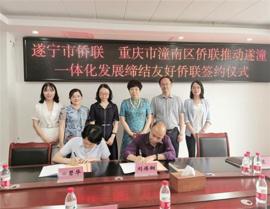 交流座谈会上,两地侨联就合力推动对外文化交流、共建高水平侨界智库、拓展海外联络联谊、搭建遂潼侨联合作机制等事宜进行了深入的交流探讨,并签订了《推动遂潼一体化发展缔结友好侨联协议》。下一步,双方将携手搭建遂潼侨联一体化行动平台、建立遂潼侨联合作系列工作机制,形成高效协作、优势互补、联动互促、多元发展的良好态势,为推动成渝双城经济圈建设贡献侨联力量。
