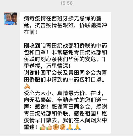除此,作为海外华侨华人的一员,当疫情在中国暴发之时,叶国平立即召集西班牙青田同乡会成员通过各种渠道购买了超过13万只口罩和600套医用防护服,全部捐赠给祖国和家乡,希望能为祖国出一份力;当西班牙疫情日趋严重时,他也组织侨胞们给驻在国慈善组织捐款,为第二故乡做点力所能及的事。