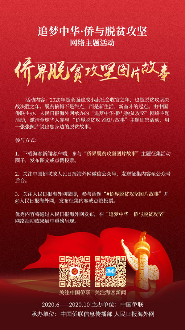 参与者可通过下载海客新闻客户端或关注“人民日报海外版海外网”微博、“海外网” 微信公众号,以及登录中国侨联官网、关注“中国侨联”微信公众号,参与话题“#喜看侨乡新变化#”、“#侨界脱贫攻坚图片故事#”等话题,说出身边的脱贫攻坚奔小康故事,将侨助脱贫攻坚的声音远播四海。