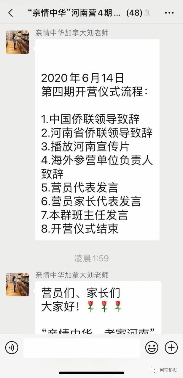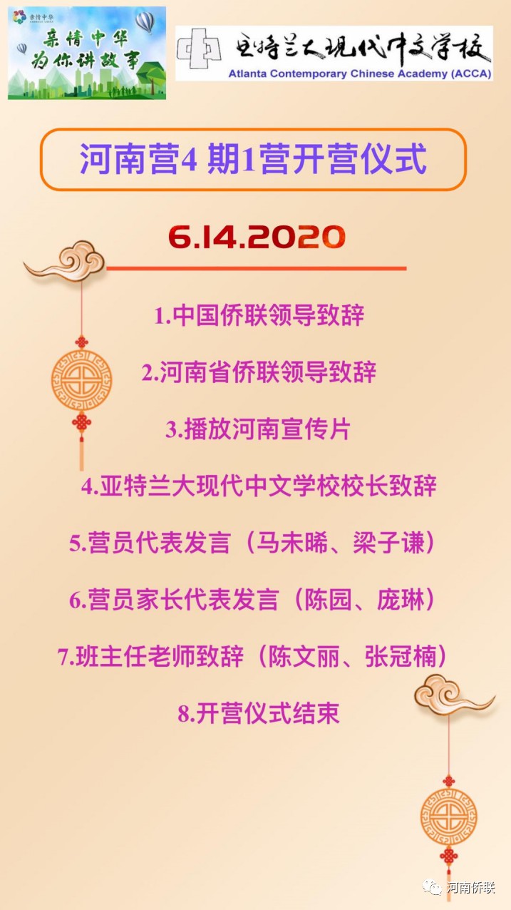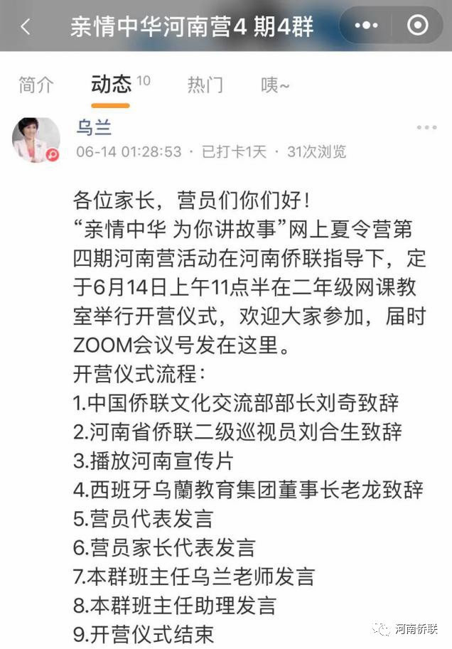 “亲情中华·为你讲故事”网上夏令营河南营第四期开营啦!为帮助广大海外华裔青少年在疫情期间坚持学习中文、培养对中华文化的兴趣,由中国侨联主办,河南省侨联、河南省华侨国际文化艺术交流协会、漯河市侨联、中美创业港侨联承办,加拿大河南同乡会、奥克兰国际艺文学院、美国亚特兰大现代中文学校、西班牙乌兰语言学校等12家海外参营单位协办的“亲情中华·老家河南”网上夏令营河南营于2020年6月14日(北京时间)分别举行了网上开营仪式。来自加拿大、美国、新西兰、西班牙、英国等国家366名海外华裔青少年报名参加。中国侨联文化交流部部长刘奇、河南省侨联二级巡视员刘合生分别为开营仪式致辞。