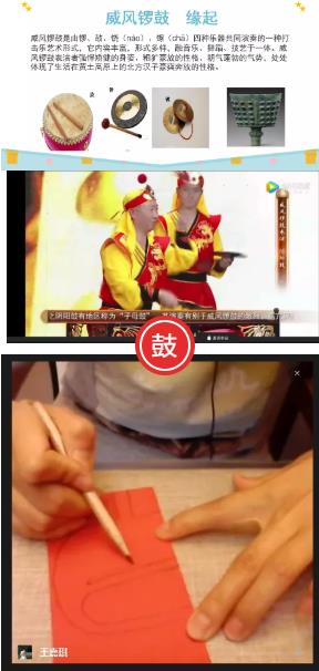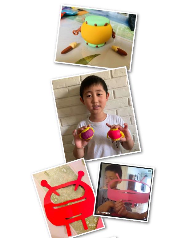 在了解威风锣鼓的起源故事后,孩子们在线看了一段民间威风锣鼓表演,看得心里跃跃欲试。接下来,大家一起隔空“拍桌子”,尝试学一些简单的鼓点节奏(虽然没有锣鼓音效,但气势总是可以学的)。孩子们还通过剪纸、粘土做出了心目中的锣鼓造型。