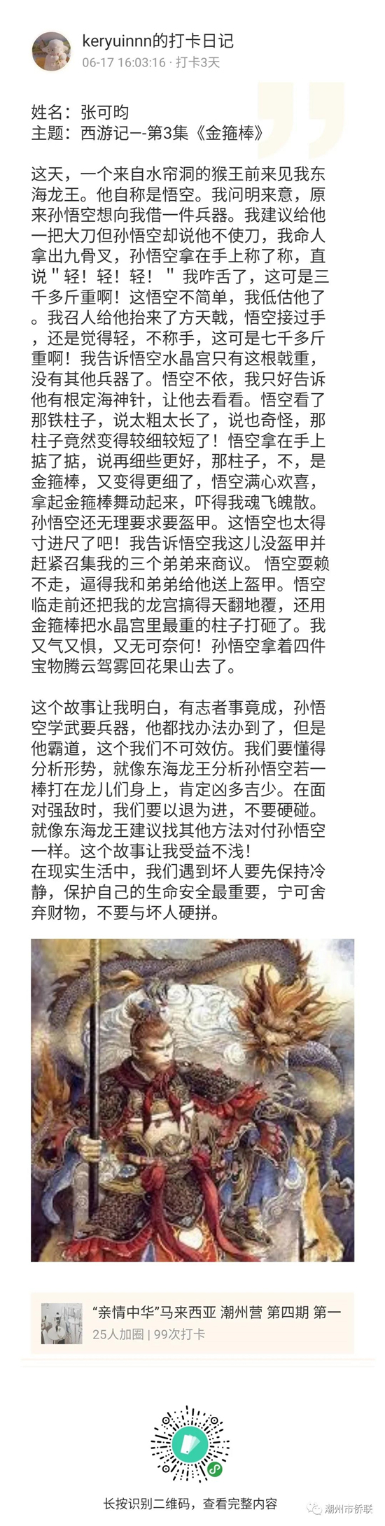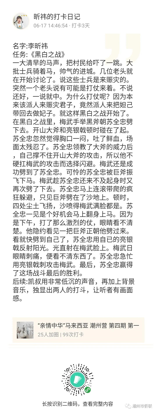 由中国侨联主办,广东省侨联、潮州市侨联承办,马来西亚潮州公会联合会举办的“亲情中华?为你讲故事”网上夏令营?广东潮州营第4期自6月14日开营以来,小营员们热情参与打卡、讨论、录制小视频等互动和展示,从中学习到丰富的中华历史文化知识。下面,让我们一起来看看营员们的精彩展示!