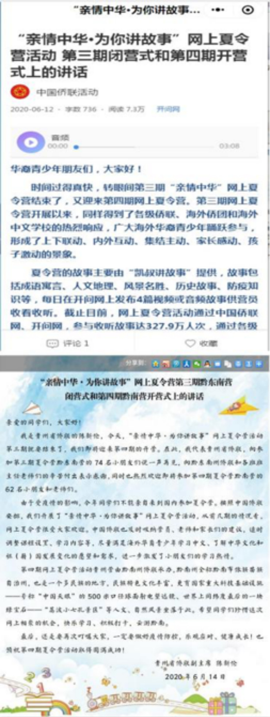 6月13日,由中国侨联主办,贵州省侨联、黔东南州侨联承办的2020“亲情中华·为你讲故事”网上夏令营第三期贵州黔东南营通过微信群举行了闭营仪式,为本期网上夏令营的云端之旅画上了圆满句号。在闭营仪式上,播放了中国侨联文化交流部部长刘奇的讲话和贵州省侨联副主席陈新伦的寄语,协办单位中英文化教育交流咨询协会、西班牙哆来咪学校的负责人分别在各营致辞。