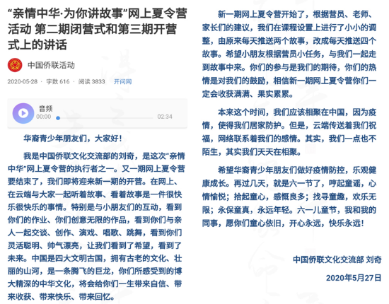 5月30日,由中国侨联主办,甘肃省侨联承办的“亲情中华·为你讲故事”网上夏令营甘肃营第三期在“云端”开启。此次网上夏令营,来自中英文化教育交流咨询协会、泰华文化教育基金会、全美寻根协会等6个海外中文学校的386名华裔青少年,将通过网络一起聆听《三国演义》《西游记》等古典名著故事、研习《三字经》、探索大自然中的神奇事物。