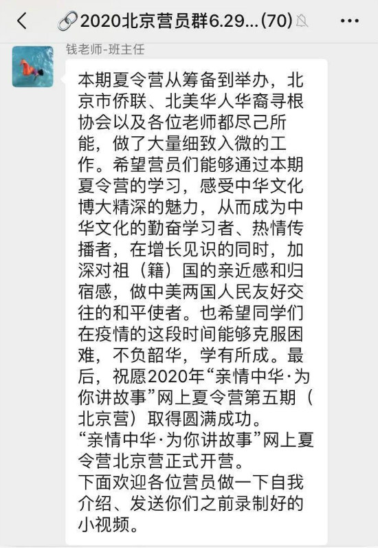 美东时间6月29日晚上9点,北美华人华裔寻根协会在微信群里为本次参加首经贸华侨营的海外学子们准备了一场特别的开营式。