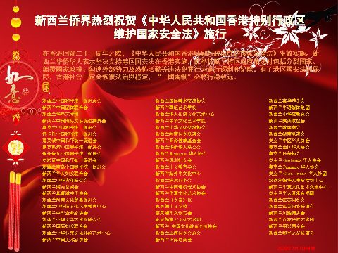 我们旅居新西兰的华人华侨坚决拥护支持涉港国安立法,坚决反对挑战“一国两制”原则底线以及严重危害中国国家主权、安全、发展利益的任何活动。香港国安法将是回归23周年祖国送给香港的最佳礼物。我们坚信有了香港国家安全法的保障,香港会更加繁荣稳定。