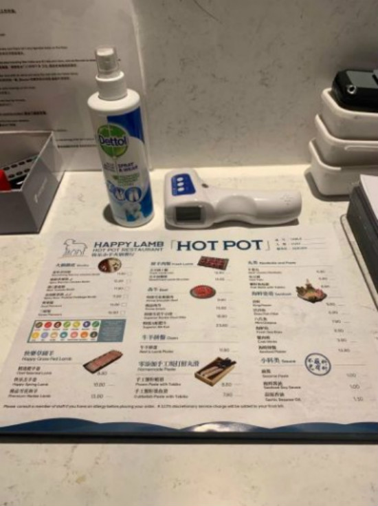 快乐小羊准备的“防疫三宝”:喷洒客人身上的消毒喷雾、体温检测仪和一次性菜单。(受访者提供)