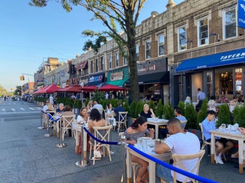 中国侨网7月6日电 据美国《世界日报》报道,新冠肺炎疫情重创纽约餐饮业,所有餐厅至少关闭堂食三个月,单靠外卖支持生意;贝赛贝尔大道上几家华人餐厅,于4日美国国庆节迎来“户外餐厅”,虽然顾客人数不如疫情前,但可以坐下来用餐喝饮品,让贝尔大道重新热闹,店家希望这道新的风景线,帮助当地经济尽快复苏。