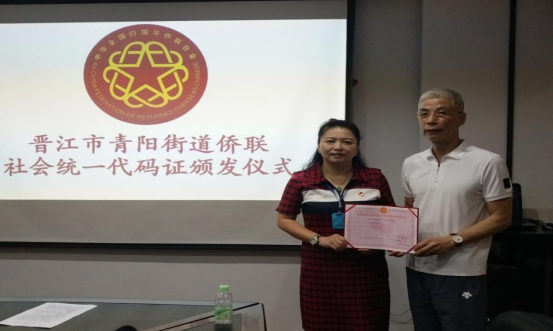 泉州市侨联钟文玲副主席为晋江市青阳街道侨联颁发代码证书