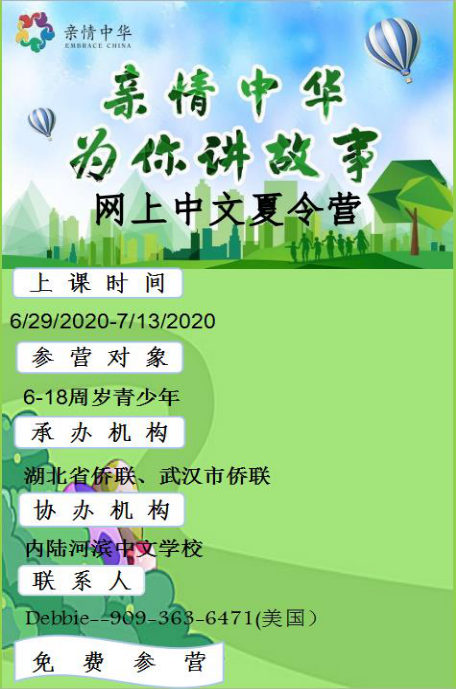 由中国侨联主办,湖北省侨联、武汉市侨联承办,美国加州内陆河滨中文学校协办,第五期“亲情中华·为你讲故事”海外华裔青少年网上夏令营期湖北武汉营开营了。本期夏令营为期15天,6月29日开营,7月13日结营。