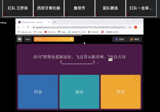 此次诗词大会的双方选手、主持人、观众通过zoom视频连线进行,其规则是把学生分为红蓝两方,以永嘉山水诗为主题,以抢答正确为加分标准。“‘六月行人须早起’下一句是什么呢?”主持人话音刚落,红队迅速抢答且回答正确。“‘借问同舟客下一句’是?”“……这首诗的作者是谁?”虽然这场诗词大会是隔着屏幕进行的,但是红蓝双方热情高涨,争先恐后,都做了充足的准备。最后蓝队获得了胜利。选手们意犹未尽,纷纷表示题目还不够多,还展示不出自己的实力,其实比赛的输赢并不是最重要的,重要的是营员们对永嘉山水诗的喜爱,他们对中华文化有了一个更深的理解。