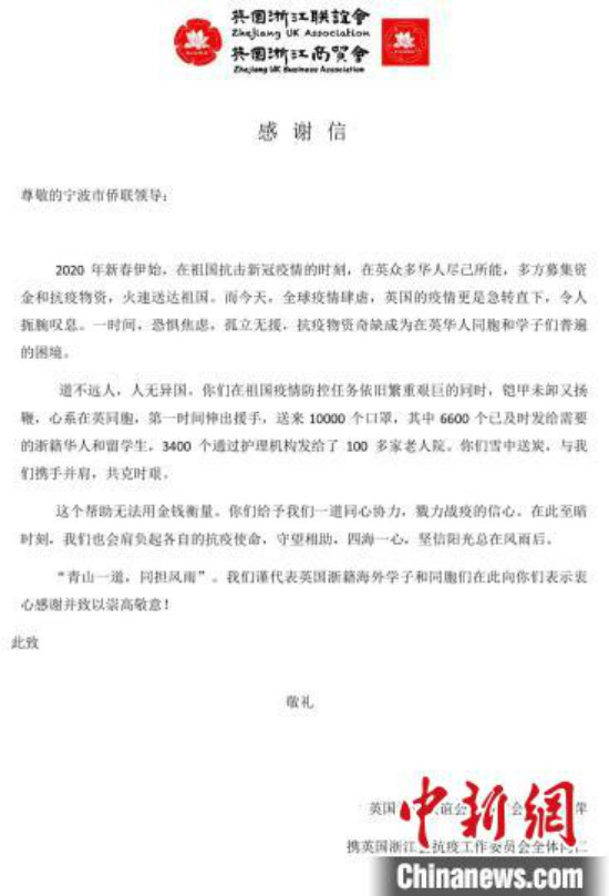 中新网宁波7月18日电(记者 林波)“青山一道,同担风雨”“急难有情,情有余兮”“隔山隔水不隔心,涓涓之水系乡情”……这是一封封海外侨团寄给浙江省宁波市的感谢信。