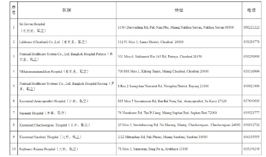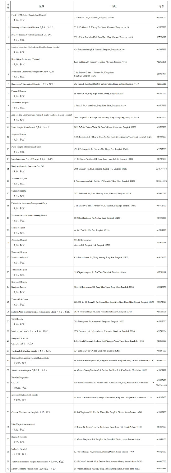 为方便赴华乘客进行新冠病毒核酸检测,经与泰国公共卫生部及相关医疗机构多方联系确认,现预先公布具有新冠病毒核酸检测资质的医疗机构名单。待使馆发布具体实施办法通知后,请根据相关要求做好检测。