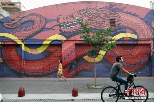 资料图:布宜诺斯艾利斯“唐人街”上一家涂有巨龙图案的店铺。中新社记者 盛佳鹏 摄