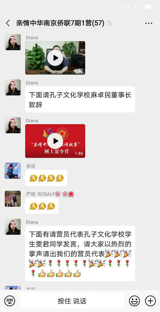 “亲情中华·为你讲故事”网上夏令营是以微信软件为网络载体,以微信群为课堂形式,课程内容包括说文解字、姓氏起源、成语寓言、名著名人、历史溯源、防疫知识等,营员们在网上学习打卡、录制视频,谈感受、谈收获、谈心得,在疫情之下的特殊时期,通过网上夏令营活动,他们学习中国传统故事,了解中华文明,不仅收获了知识和友谊,而且还得到了快乐和成长。