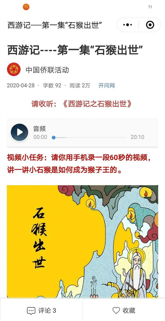 为了传播中华文明,讲好中国故事,自2019年起,南京市侨联便着力组织海外华裔青少年“寻根之旅”夏令营、冬令营,让世界各地的华裔青少年有机会踏上故土,了解中国。然而,2020年疫情之下,“寻根之旅”难以成行,如何帮助广大海外华裔青少年在疫情期间坚持学习并深入了解中华文化、培养对中华文化的兴趣,同时获取抗疫知识?南京市侨联创新载体举措,以“亲情中华·为你讲故事”网上夏令营的方式,吸引了来自美国、韩国、西班牙等国的1305名华裔青少年营员以听故事及线上打卡、互动等形式,开启了中华文化学习之旅。