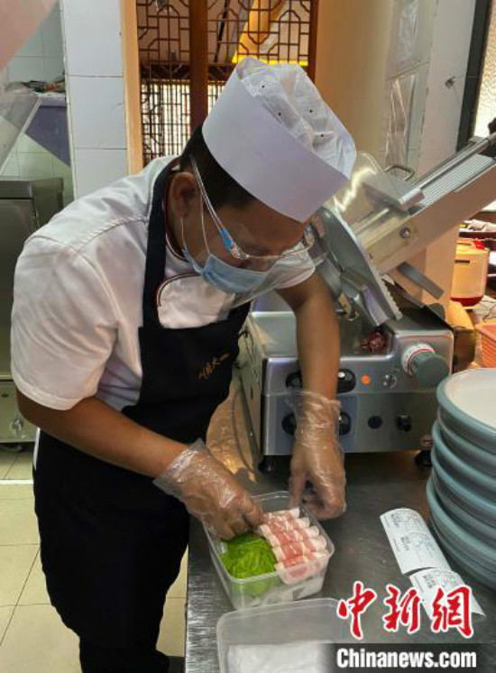 图为川府火锅店厨师正准备外卖火锅料。 冯燕 摄
