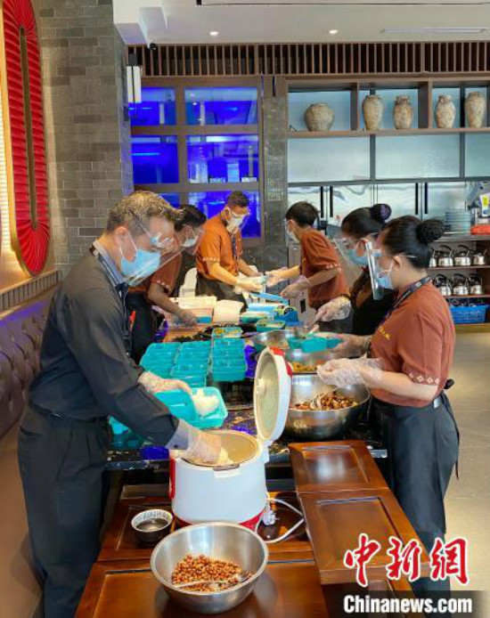 图为川府火锅店员工正打包外卖盒饭。 冯燕 摄