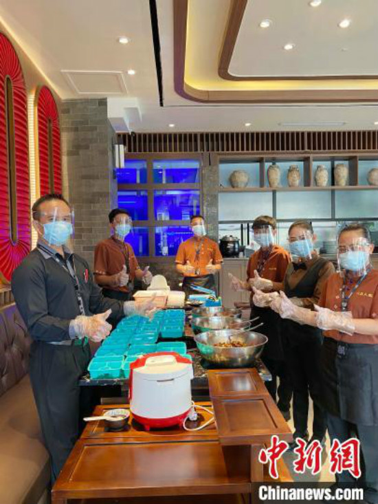 中新网记者在该餐馆看到,虽然没有外人,但所有员工都穿着干净整洁的制服,戴着口罩、面罩和手套在忙着各自的活;配送食材物料的人只能在门口交接不能进入店里,所有物料外包装都经过酒精消毒后才由专人拿进店里。