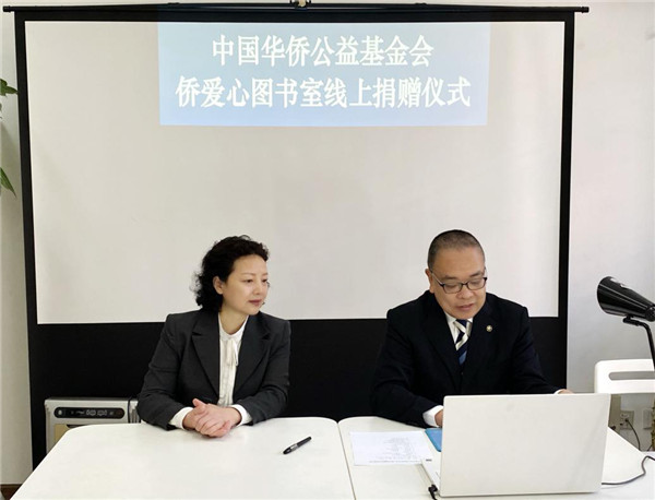 2020年10月12日在中国华侨公益基金会、中华人民共和国驻大阪总领馆及神户中华同文学校进行了中国华侨公益基金会侨爱心图书室线上捐赠活动。中华人民共和国驻大阪总领馆总领事何振良、副总领事张玉萍,中国华侨公益基金会秘书长何继宁,神户中华同文学校校长张述洲,副校长王政夫等参与了此次线上会议。会议由何继宁秘书长主持。