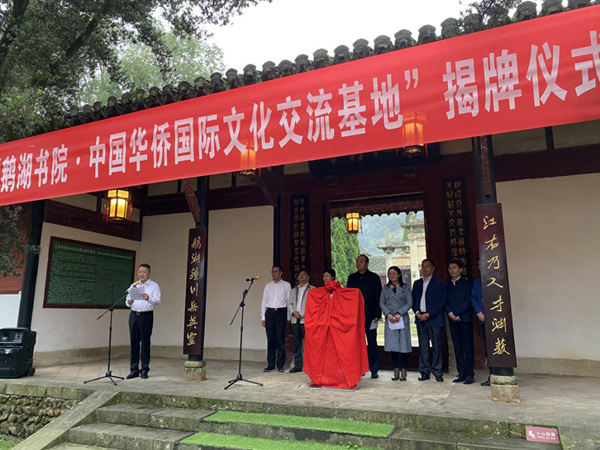 10月16日,“中国华侨国际文化交流基地”揭牌仪式在江西省上饶市铅山县鹅湖书院举行。中国侨联文化交流部部长刘奇,江西省侨联党组成员、副主席罗丽都,中共铅山县委副书记倪美创,中共铅山县委常委、统战部部长曾锡沪等共同为“中国华侨国际文化交流基地”——鹅湖书院揭牌。