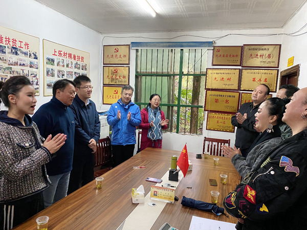 18日演出结束之后,“亲情中华”艺术团的艺术家们还来到周臻扬生活工作的村委会办公室,专门为他送上一曲深情的《我和我的祖国》。看到办公室墙上挂满的一张张工作照以及一块块奖牌,艺术家们由衷地为这名年轻的挂职扶贫干部点赞鼓掌。