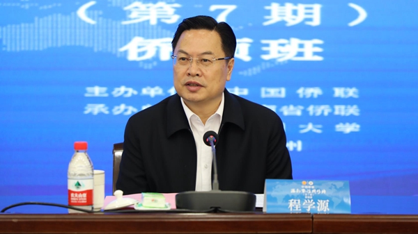 程学源在开班式致辞中代表中国侨联对各位学员表示欢迎,他希望广大侨团骨干,一是主动融入和回馈当地社会,讲好中国故事,让世界了解全面、立体、真实的中国,增进住在国人民同中国人民的友谊,做中外友好交流的桥梁使者;二是立足于“两个一百年”奋斗目标,将个人奋斗与国家民族前途紧密结合,投身祖(籍)国的地方经济社会发展,为实现中华民族伟大复兴的中国梦贡献侨界力量;三是心怀家国情怀,做推动构建人类命运共同体的参与者、实践者。