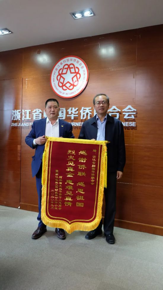 10月21日,浙江省第十次归侨侨眷代表大会刚刚落下帷幕次日,阿联酋迪拜龙城华侨华人总商会会长金国中专程到访省侨联,代表旅阿浙籍困难侨胞送来了鲜红的烫金锦旗,感谢“娘家人”危难时刻及时提供防疫物资。