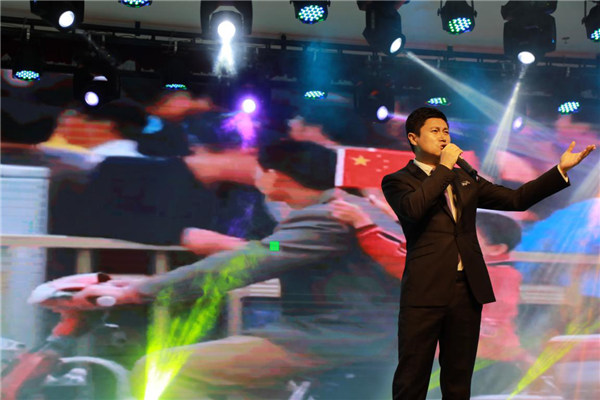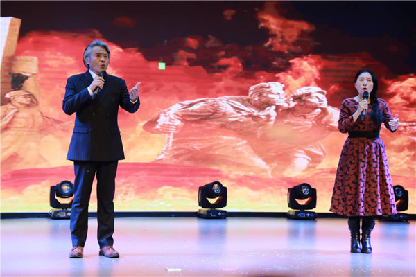 电影《黄大年》中“侨界楷模”黄大年的扮演者张秋歌在诗朗诵结束时情难自抑、声音哽咽,他含着眼泪,深情地说:“我们不远千里,就是向白衣天使学习,向英雄们致敬!”