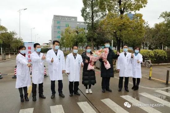 ▲李刚教授(左四)等医护人员与出院新冠肺炎确诊患者合影