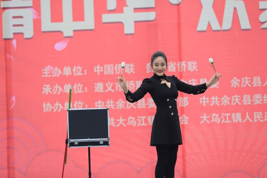 在突破乌江纪念园广场,舞台背景板上“英雄迴龙渡,红色大乌江”十个字遒劲有力,巧妙点出了演出地点的特殊性。优美动人的歌声、韵味十足的舞蹈、出神入化的魔术、慷慨激昂的诗朗诵……近两个小时的表演中,观众热情高涨,掌声、叫好声、欢呼声此起彼伏。