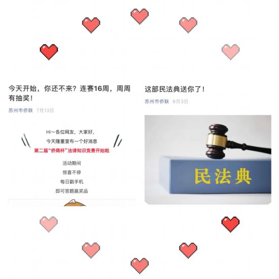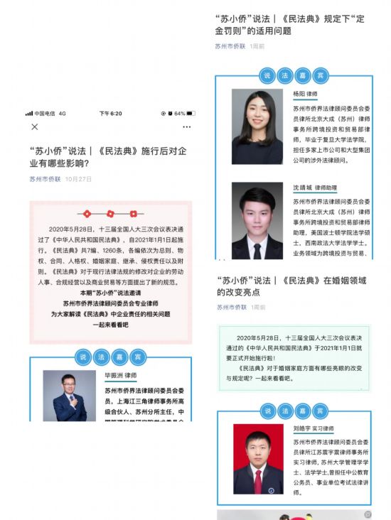 为推动侨界学法用法更加“接地气”,苏州市侨联在微信公众号品牌栏目“苏小侨”说法中开设《民法典》专题,邀请侨界法律顾问委员会委员分类策划、以案释法,从民法典的视角剖析具体案例并给出法律提示,创新宣传形式,增强普法实效,推动形成全社会共同学习、遵守、维护民法典的浓厚氛围。