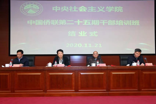 11月21日下午,中国侨联第二十五期干部培训班在中央社会主义学院举行结业式。中国侨联党组成员、副主席隋军出席结业式并作总结讲话。中央社院党组成员、教务长徐绍刚出席结业式并代表中央社院致辞。中国侨联组织人事部部长、干部培训中心主任姚林楠主持会议。