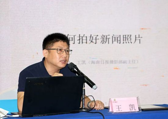 海南日报摄影部副主任王凯与学员们分享新闻照片拍摄经验(陈苏琤 摄)