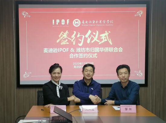 该项合作是为了贯彻新发展理念和山东省潍坊市委、市政府中国(潍坊)资本论坛及推动企业上市部署精神,促进潍坊及山东的产业结构升级、企业健康可持续发展、以资本运营思维撬动地方经济,整合产业链供应链做大做强,依托麦迪逊IPOF山东(潍坊)中心,用专业的资本运营服务,结合自身成功的实操经验,为地方企业提供科技孵化和资本孵化服务。计划每年投融资20亿元,在山东省潍坊市及山东省现有的企业中进行选种、育种,每年孵化100家种子公司,重点定制5-10家海内外上市IPO公司,打造10-20准上市公司,并实现10-20家重组并购公司。优先孵化侨资企业。