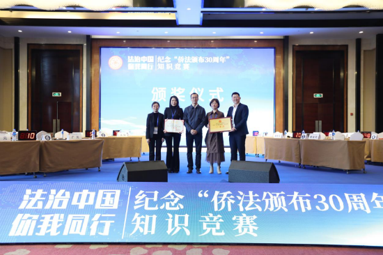 为认真学习贯彻习近平法治思想,深入贯彻落实党的十九届五中全会和中央依法治国工作会议精神,纪念《中华人民共和国归侨侨眷权益保护法》颁布30周年,12月3日,由中国侨联权益保障部指导,四川省侨联、省人大外侨委在成都联合主办了“法治中国·你我同行”----纪念“侨法颁布30周年”知识竞赛活动。中国侨联权益保障部副部长马鑫出席开赛仪式并为获得一等奖的代表队颁奖。